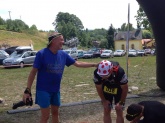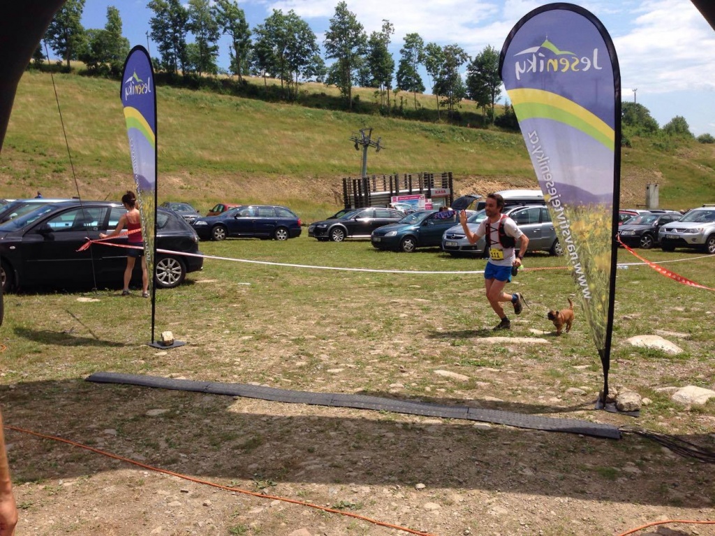 Posledních pár set metrů před cílem vede po posekaných loukách nad Hynčicí. To seno snad odráží ten hic. Nikde žádnej stín a já se podepřen prošlým gelem ploužím směrek ke Kolovně, odkud už je to jen asi 300 metrů do cíle. Sbíhám kolem Kolovny na asfaltku a vidím cílovou rovinku, která je pro změnu krutě nakloněná do plusových hodnot. Zatínám nohy v pěst a probíhám cílem v čase 3:30:03, což je minimálně půl hodiny za mým předpokladem. V cíli mě „vítá“ šéf české skyrunningové asociace Sam Straka a dle fotky níže evidentně „oceňuje“ mou formu. Díky dcerce Martina Koukala Sandře absolvuji také malý květinový ceremoniál a jdu najít místo, kam položím šavli a pomodlím se k bohům gelu, vedra a běhu.